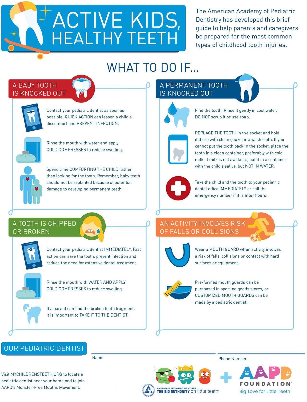 With warmer weather, outdoor activities and sports starting, we want to keep parents informed in the case of mouth injuries. Here is some information from the American Academy of Pediatric Dentistry to help parents be prepared for the most common types of childhood tooth injuries.